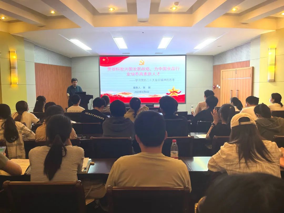 张剑以《贯彻科教兴国发展战略,为中国食品行业培养高素质人才》为主题作了第四期主题教育专题党课。他带领同学们回顾党的二十大会议主题,提出优质的高等教育是中国式现代化实现的重要基石,科技和人才是实现中国式现代化最重要的推动力。同时,他从历史和自身经历向同学们强调学习的重要性,向同学们提出终身学习的要求。接着,他通过分析近十年农业科技的现状以及发展趋势,向学生们提出“加快核心技术攻关,推动产乡村振兴”的希望,对同学们未来的择业选择问题提出诸多建议。