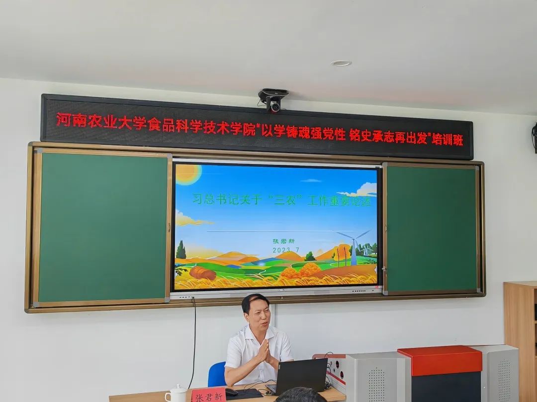 河南科技大学农学院党委书记张君新教授作题为《习总书记关于“三农”工作重要论述》的报告,在报告中他从全面学习理解上下功夫,在全面把握上下功夫,全面落实上下功夫三个方面进行讲解。讲解既有习近平总书记关于“三农”工作的重要论述,也结合实际情况,从中华民族发展史上深刻学习理解“三农”,从“胸怀两个大局”中深刻理解“三农”,从中国式现代化上牢牢把握“三农”工作重要地位。在落实过程中他从如何全面实现“三农”的方法上进行阐述。整篇报告内容丰富、详实,既有理论基础,又有具体实例,为学院助力“三农”工作指明了方向。