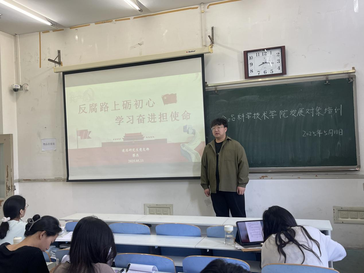 5月11日上午,速冻研究生党支部支委蔡杰以“反腐路上励初心,学习奋进担使命”为主题展开培训。他指出,党中央高度重视党风廉政建设和反腐败斗争,将其视为党和国家生死存亡的关键。党风廉政建设直接影响党的执政基础和执政能力,因此必须坚定理想信念,加强道德修养,严明政治纪律,强化制约监督。要坚持全面从严治党,思想建设、队伍建设、作风建设、组织建设都要坚持从严要求,确保党的纯洁性和先进性。