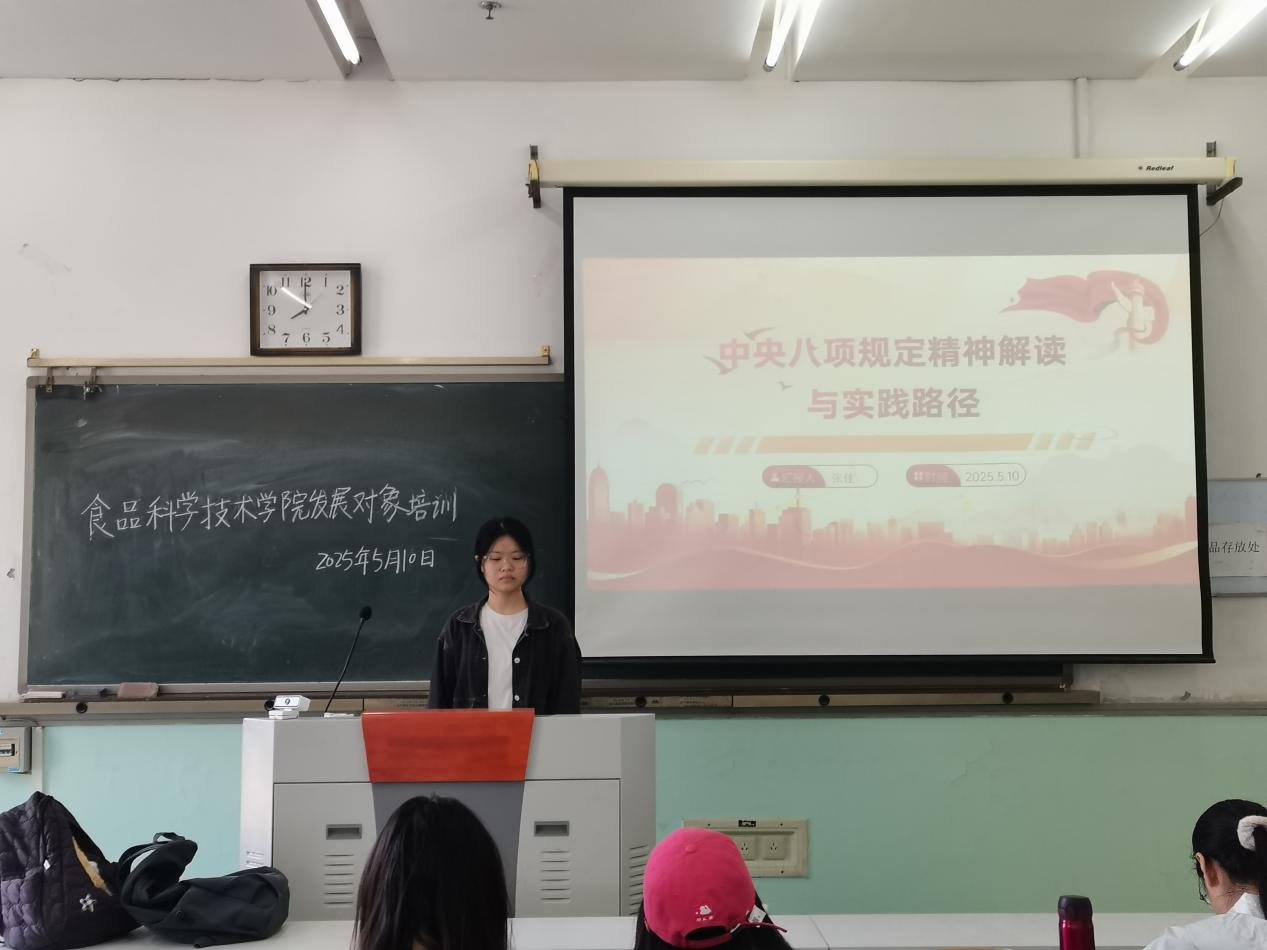 5月10日,食安专业学生党支部张佳开展了以“学习中央八项规定精神”为主题的培训。通过讲授中央八项规定的核心内容以及如何深入贯彻中央八项规定,加强作风建设等内容,要求发展对象全面强化思想教育、筑牢信仰之基,注重廉洁自律,改良工作作风。深入理解此次培训内容,有助于发展对象们更好的强化纪律意识,以严明的纪律、务实的作风和清廉的文化融入组织管理,从而更好地应用这一思想来推动自身健康发展,发挥党员的示范作用。