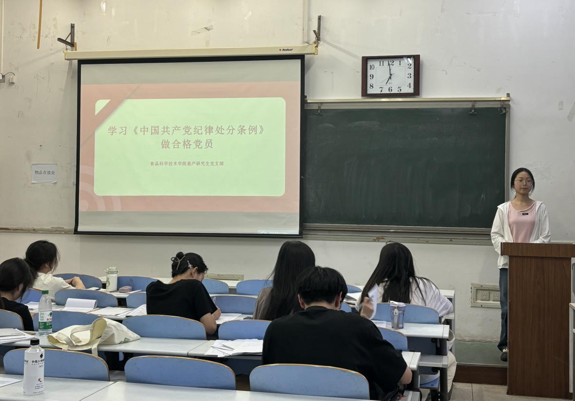 5月11日,畜产研究生党支部麻晴晴主要围绕《中国共产党纪律处分条例》的修订意义、主旨要义及贯彻执行三个方面展开主题培训,强调《条例》修订是促进全党深刻领悟“两个确立”、做到“两个维护”的必然要求,是贯彻习近平新时代中国特色社会主义思想的具体行动,也是解决现实问题、总结经验推动制度发展的需要,通过严明政治纪律、加强全方位管理监督、激励党员担当作为、坚持党性党风党纪一起抓、促进执纪执法贯通等多方面举措,全面从严规范党组织和党员行为。发展对象要在服务党和国家大局中领会《条例》要义,养成遵规守纪的习惯。