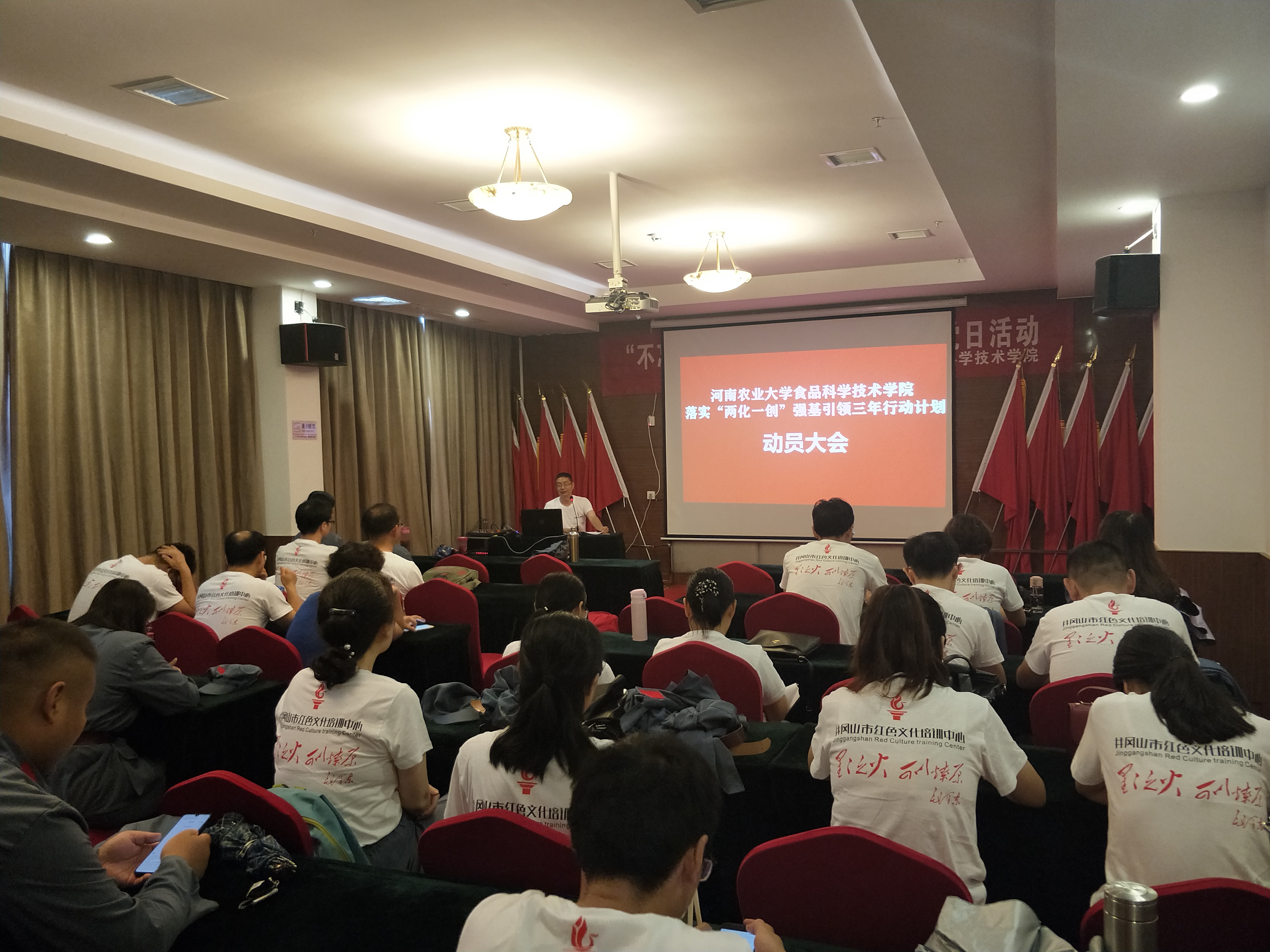 在井冈山红色文化培训中心第八会议室召开党支部建设“两化一创”工作动员会,学院全体教工党员参加会议,会议由学院党委书记杨喜洲主持。