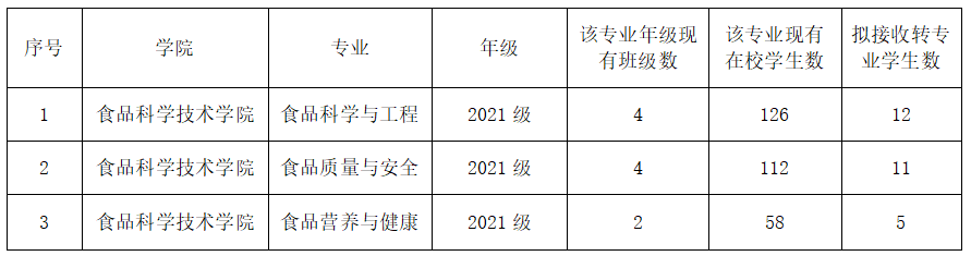 食品科学技术学院拟接收转专业学生名额分配统计表