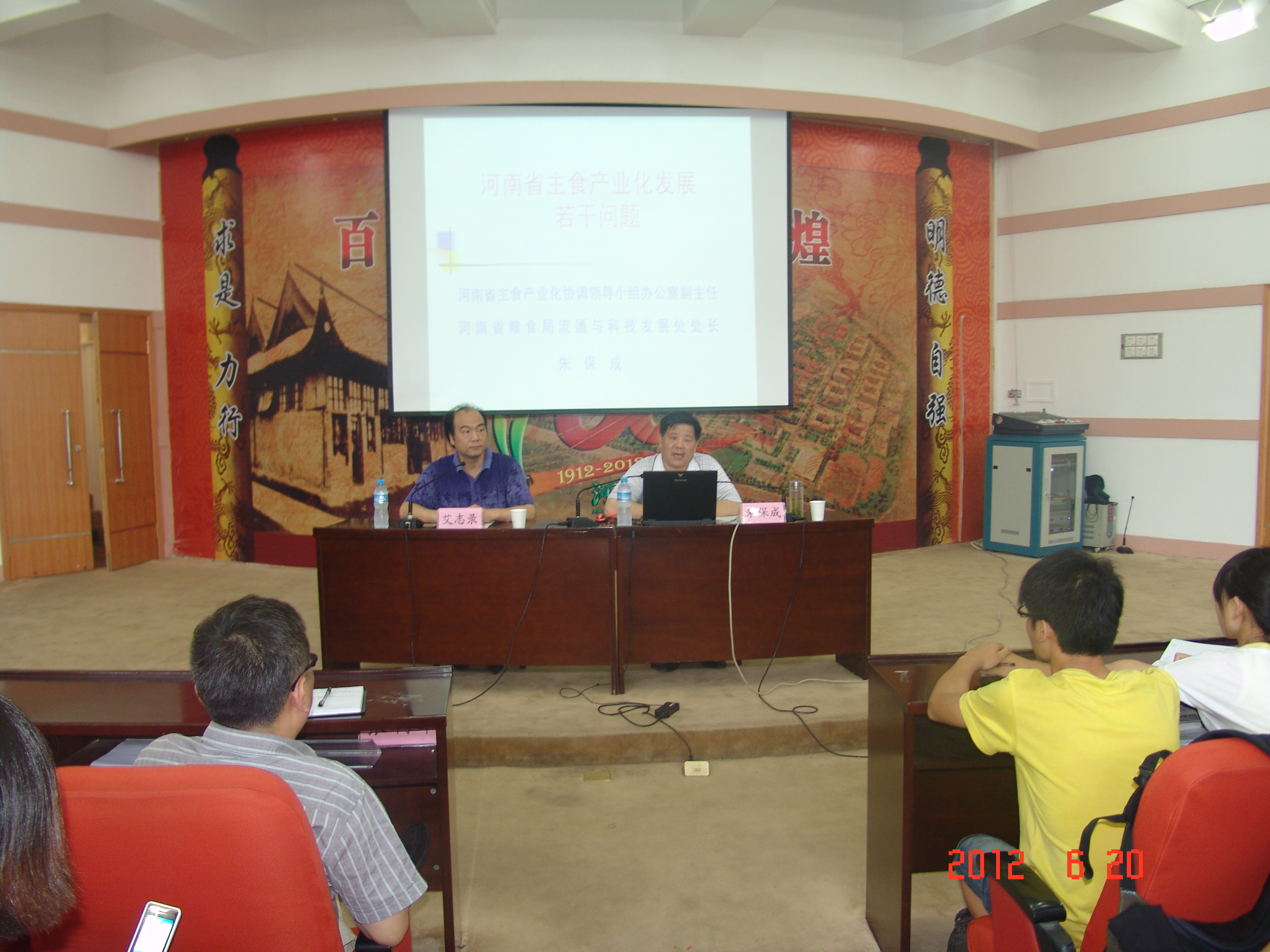 6月20日上午,河南省主食产业化协调领导小组办公室副主任、河南省粮食局流通与科技发展处朱保成处长应邀在校300人报告厅为探花 师生作了一场题为《河南省主食产业化发展若干问题》的专题学术报告会,报告会由探花 副院长艾志录教授主持。