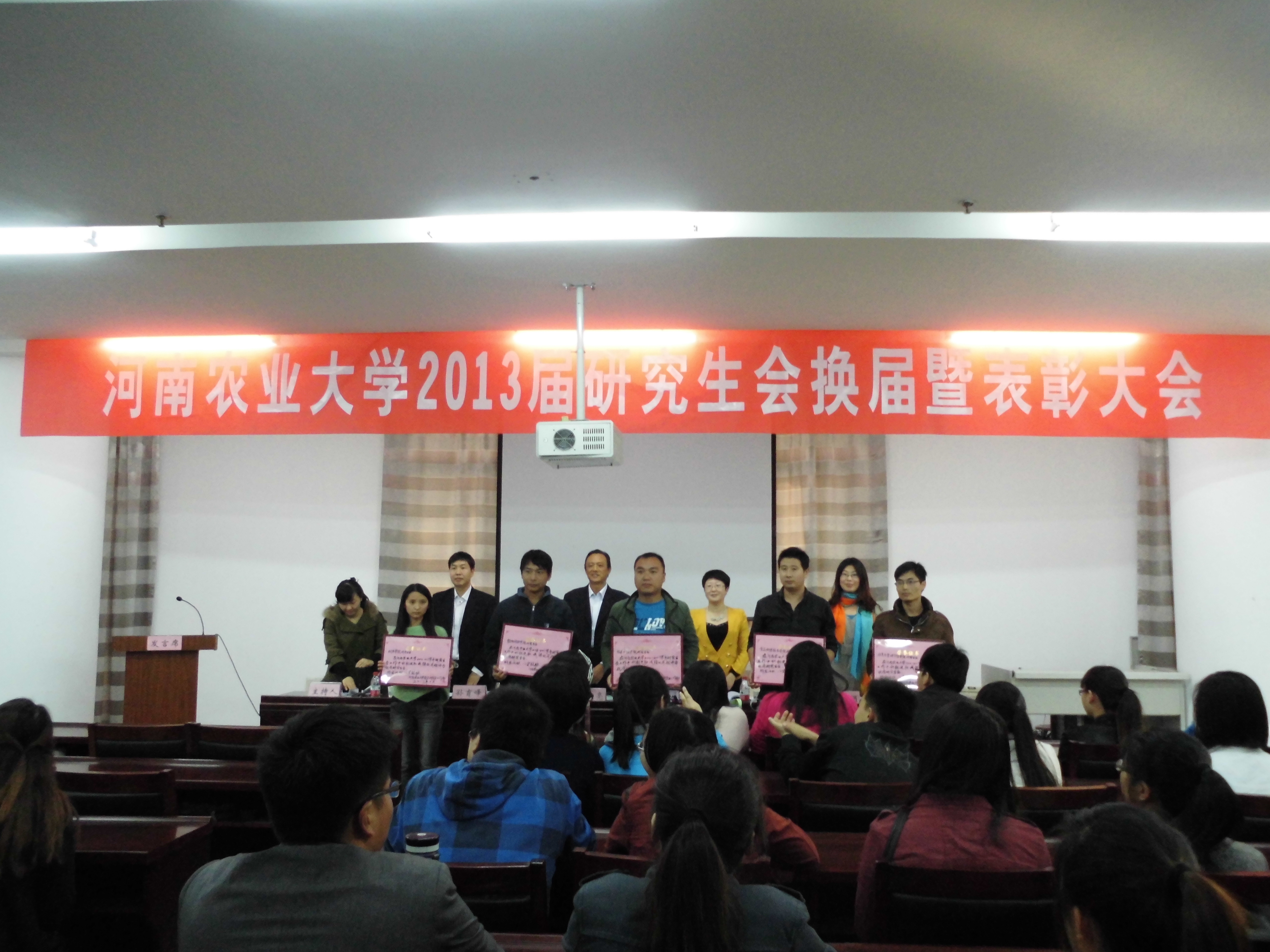 在探花 2013届研究生会换届暨表彰大会上,探花 研究生会等五个学院获得了 “优秀研究生分会”荣誉称号,侯志强等16人获得了“优秀研究生会干部” 荣誉称号。学院新一届研究生会表示要刻苦学习、无私奉献,积极进取,努力成为引领研究生思想的先行者、先进校园文化的倡导者、服务研究生成长的实践者、研究生教育管理的参与者,更好地服务于广大师生,为加快创建全国一流农业大学做出自己应有的贡献。(袁乾乾)
