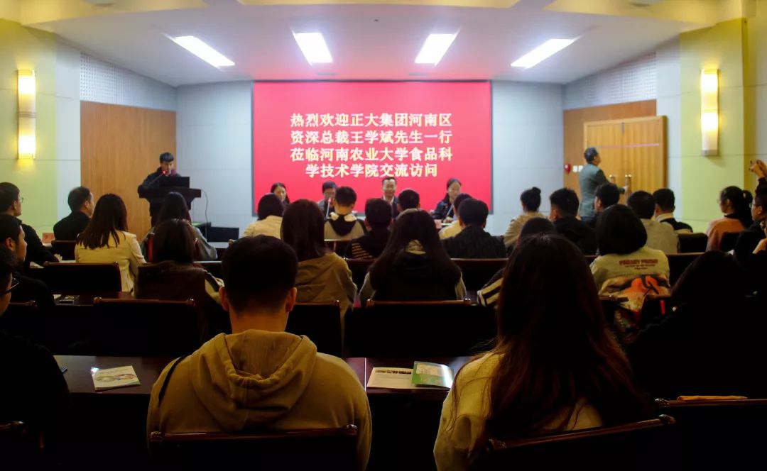 在文化路校区一百人报告厅举办创新创业指导老师聘任仪式暨“4C创青春”创新创业企业家大讲堂。正大集团河南区资深总裁王学斌先生应邀出席大会,院长赵改名、院党委副书记魏玮、河南省肉制品加工与质量安全控制重点实验室副主任李苗云、院团委副书记杨光和院辅导员黄姗姗出席报告会。学院研究生和本科生代表参加大会。