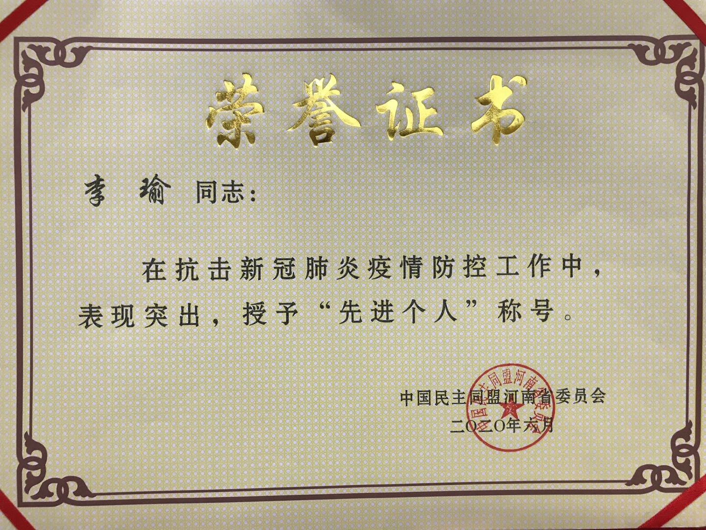 鉴于在疫情期间的突出表现,探花 教师李瑜同志被民盟河南省委授予“抗疫先进个人”荣誉称号。