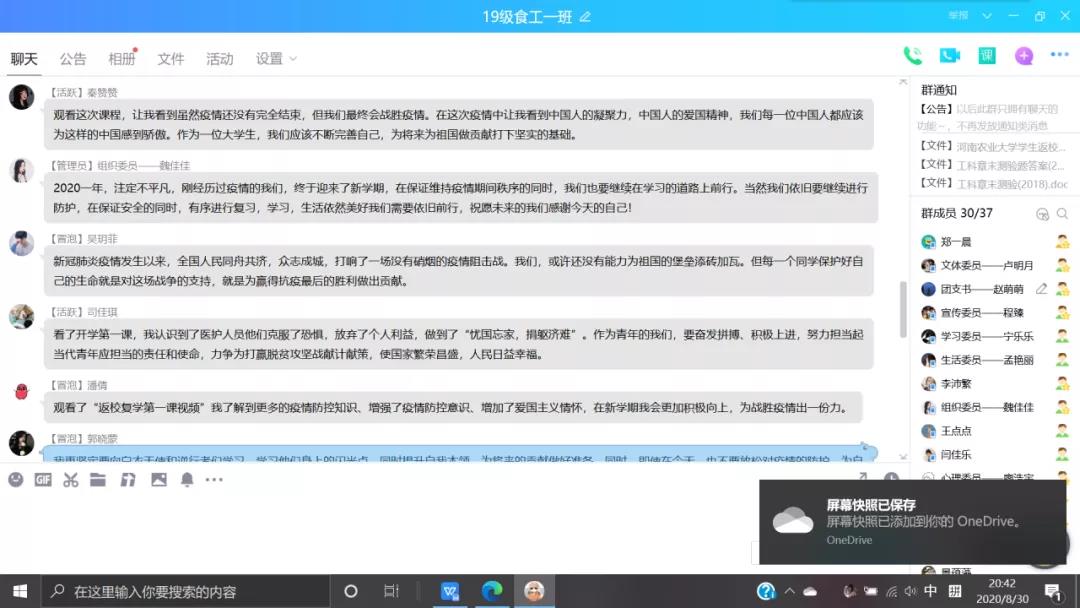 活动过程中,各班长、支书以宿舍为单位组织学生观看河南高校“返校复学第一课”、探花
