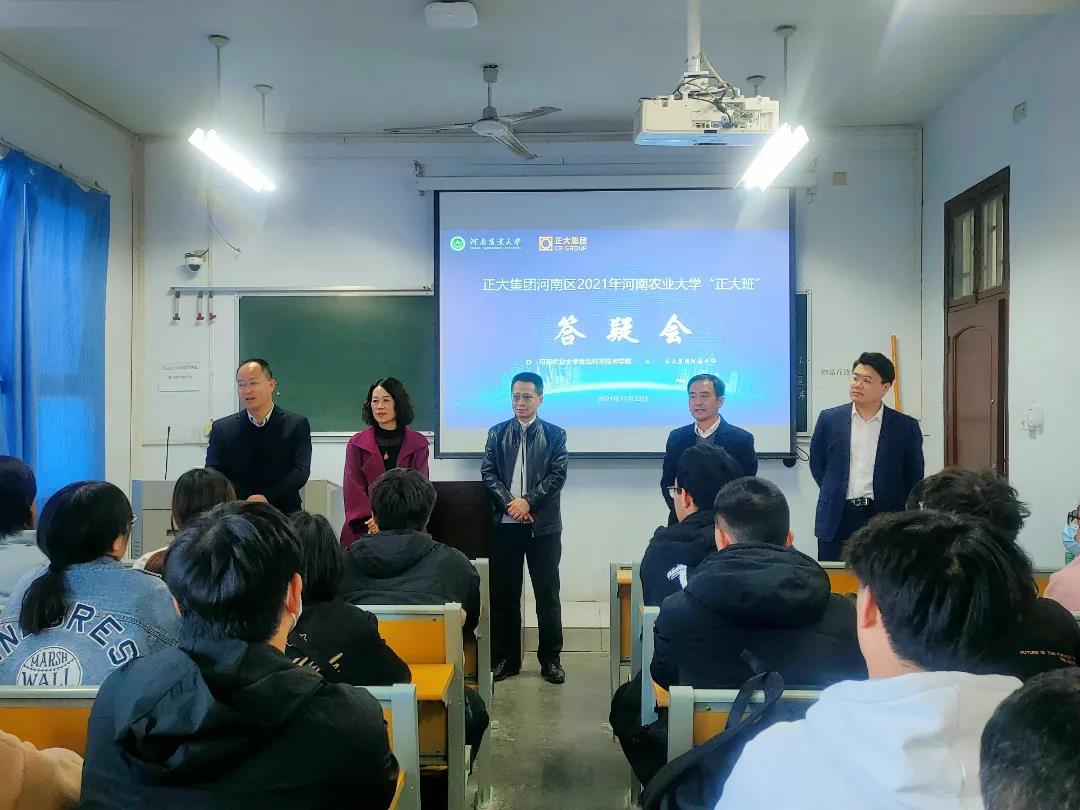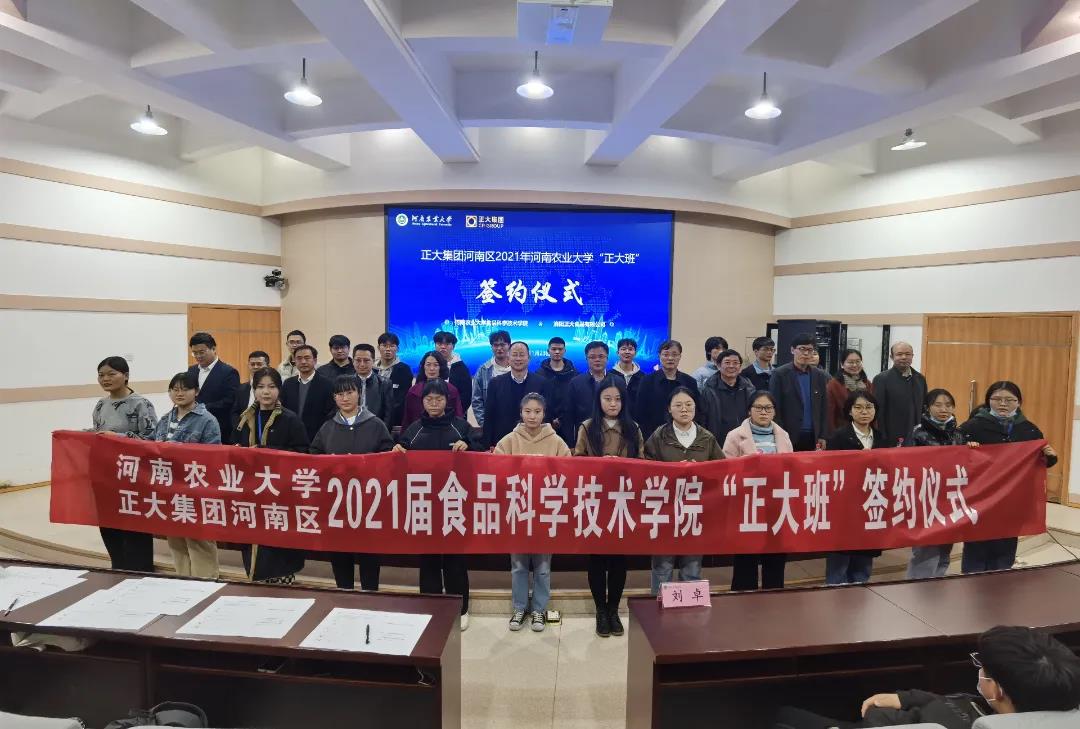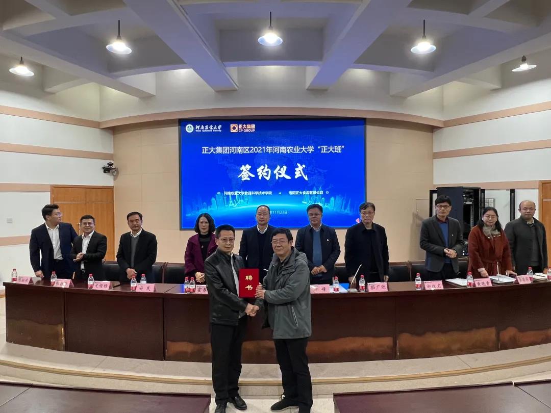 “正大班”签约仪式,洛阳正大食品有限公司副总裁沈道华、正大集团河南区人力资源总监霍春阳、洛阳正大食品有限公司市场总监安民、正大集团河南区饲料养殖事业人事主管文俊雅、洛阳正大食品有限公司人力主管张振华、正大集团河南区招聘总监陈柏希、校党委学工部部长徐峰、校教务处副处长茹广欣、探花