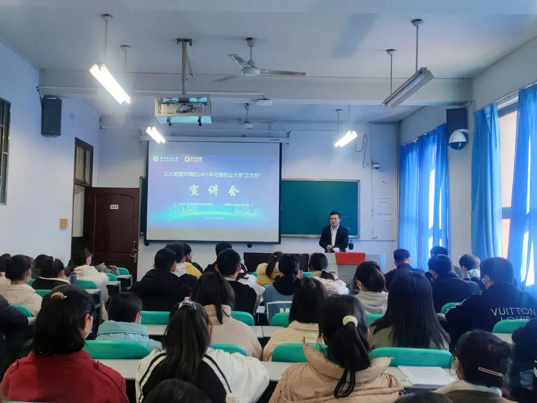 沈道华详细介绍了正大集团的基本情况和校企合作进展。他讲到,正大集团与高校共建正大班是推进校企合作的创新举措,是积极响应国家号召,实现校企联动,合作共赢,将产教融合推向新高度的重要一步。正大班协议是经过校方和集团多次协商讨论的结果,同学们要抓住机遇,努力发展,为中原、河南的发展贡献力量。