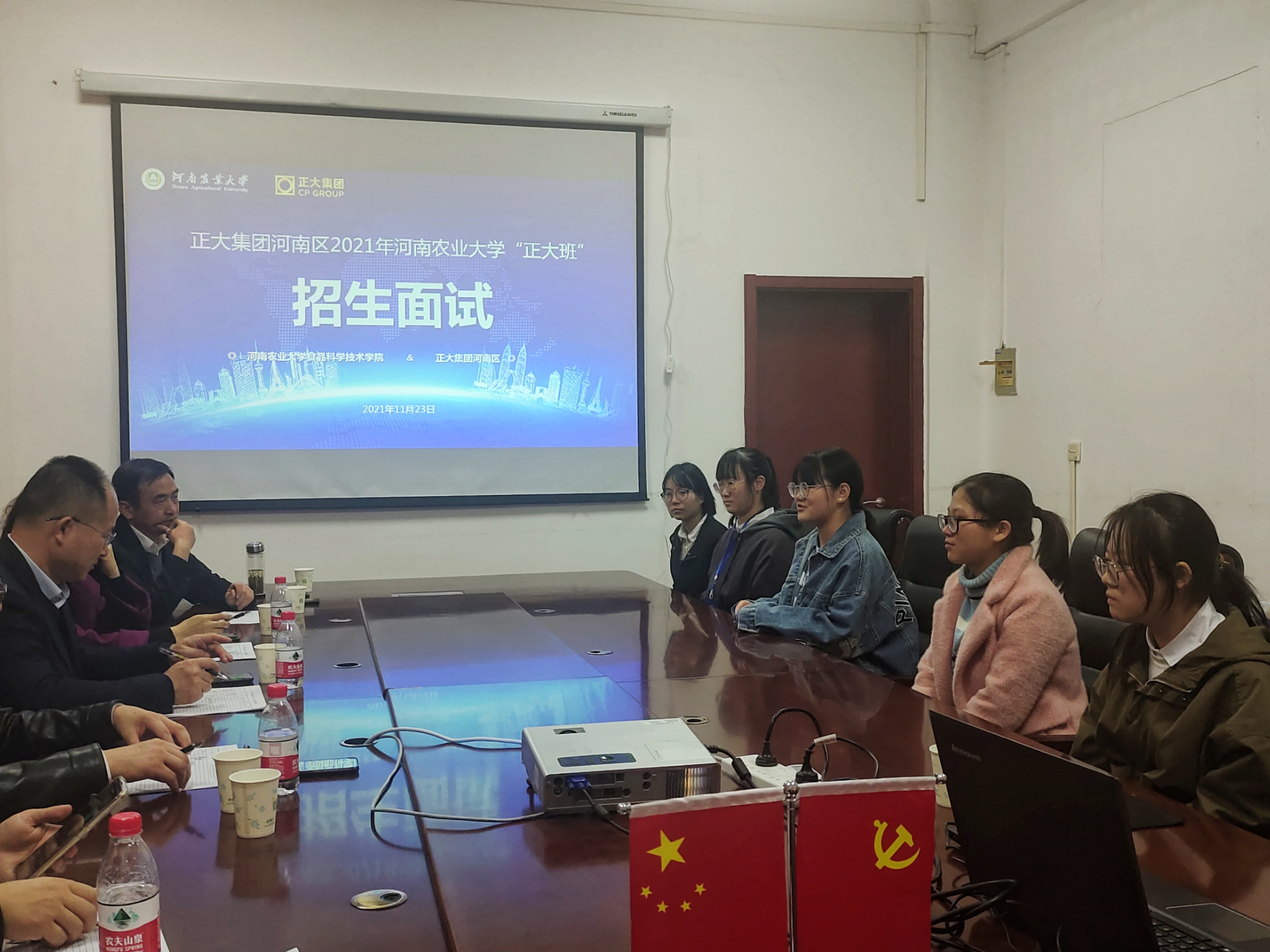 签约仪式前,正大集团有关负责人分三个会场面向全体21级同学开展宣讲会,详细介绍了正大集团的历史、产业链等基本情况和“正大班”的培养模式、师资建设等内容。互动答疑环节,学院领导和企业高管与同学们亲切交流,对大家关心的问题进行一一解答。校企双方领导对提交申请的同学进行面试,进一步了解了同学们的学习情况、家庭状况和未来规划,并对协议中的部分内容进行了沟通交流。