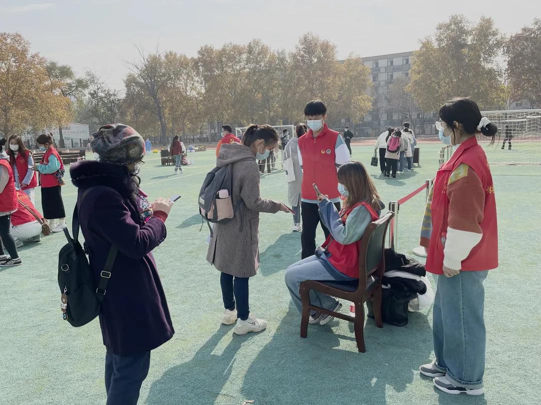 青年志愿者提前在等待区维持现场秩序,提醒同学们佩戴好口罩,保持安全距离,做好个人防护,同时,引导学生提前完成网上核酸检测的预约,为第三轮核酸检测做好准备工作。同学们有序排队进入核酸检测区域,由信息登记员扫码后进行核酸采样工作,并在志愿者的引导下依次从操场西门迅速离开,整个流程操作规范、防护到位、安全严谨。