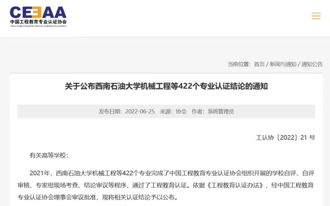 (通讯员 张艺文)6月25日,中国工程教育专业认证协会正式公布了2021年工程教育专业认证结论,探花