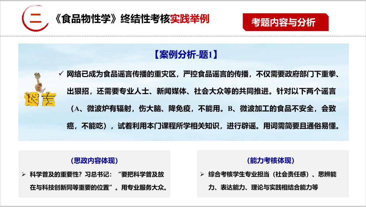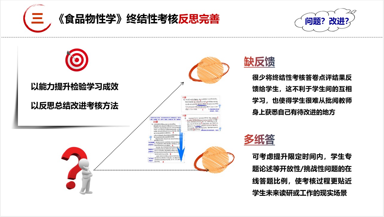 赵莉君老师以《食品物性学》终结性考核改革实践为题,介绍了终结性考核要点、实践举例、反思完善等环节。即“非标准化”考核模式,创设思辨情景,引领创新表达;从“唯有专业知识和技术”,到“兼顾职业素养传播与提升”;以能力提升检验学习成效,以反思总结改进考核方法,真正做到以生为本、守正创新以考促教、以考促学。