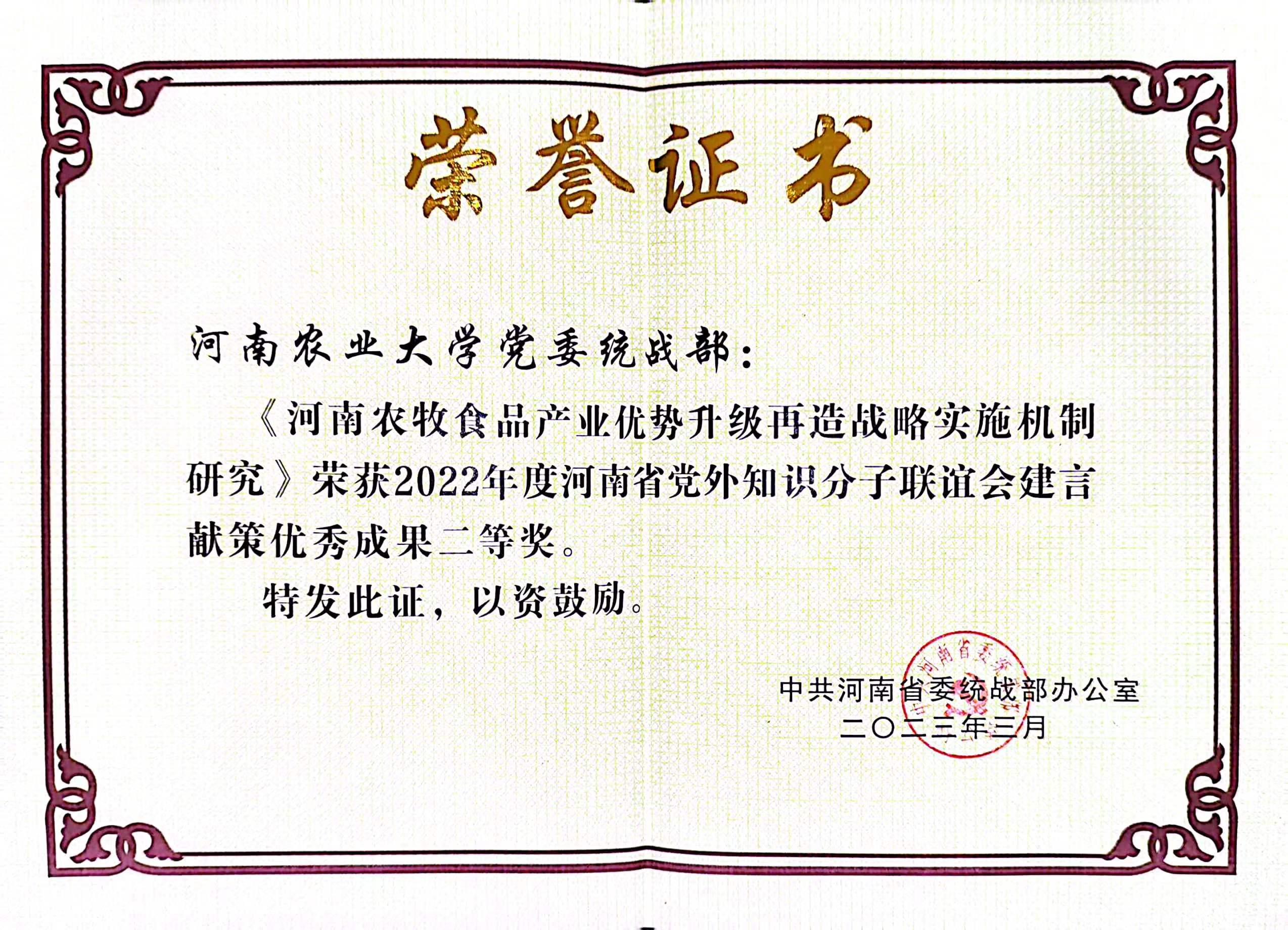 (通讯员 李瑜)近日,河南省委统战部下发《关于2022年度河南省党外知识分子联谊会建言献策优秀成果的通报》,探花 教师李瑜、何玉静共同完成的《河南农牧食品产业优势升级再造战略实施机制研究》获建言献策优秀成果二等奖。