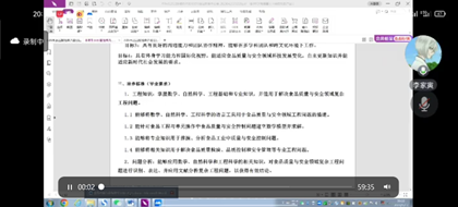 (通讯员 王田林)为积极推进食品质量与安全专业工程认证的筹备工作,5月17日晚上,食品质量与安全系主任索标邀请了食品科学与工程专业教师同时也为学院教学秘书李家寅老师就工程认证做线上培训。全体食安系教师和承担食安专业课程的老师参加了此次培训。李老师首先分享了食品科学与工程专业教育部工程教育专业认证的经验心得。李老师指出,教育部工程教育专业认证主要对专业学生培养目标、质量、师资队伍、课程设置、实验设备、教学管理、各种教学文件及原始资料等方面进行评估。工程认证作为一个系统性工作,不管在硬件还是软件上,都需要集学校之力量进行统筹准备,需要学院全员积极参与。学校要以学生为本,面向全体学生;以学生为中心,以学生学习产出为导向;强调合格评价与质量持续改进。接着,就食品质量与安全专业工程认证的具体注意事项,包括本科生课程设置、培养计划、毕业实习、毕业论文等,与老师们进行交流。同时,又讨论了按照加强党员干部教育的有关要求,以理想信念教育为主线,以提高党员干部素质,增强基层党组织的凝聚力、战斗力,发挥好党组织和党员干部作用为目的,不断解放思想,开拓创新,积极开展形式多样的教育培训活动。