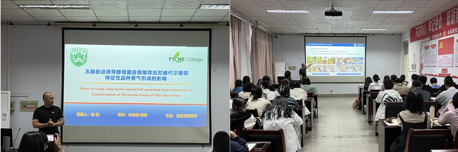 | 17#405 | 2023.10.17 | 15:45-16:45 | 陈凯 | 冻融胁迫诱导酵母菌自组装对威代尔葡萄品种香气的调控机制 |