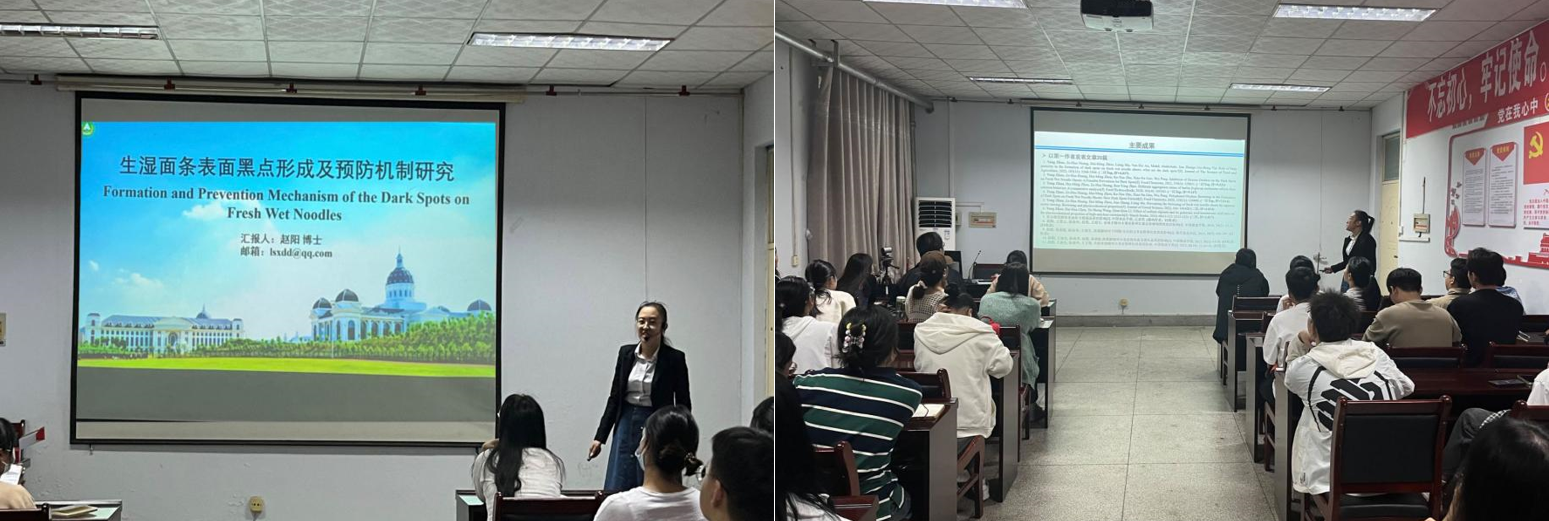 赵阳博士向在场研究生讲解了生湿面条表面黑点的形成及预防机制,并详细介绍了其研究方法与研究思路,令在场研究生获益匪浅。