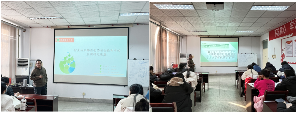 朱鸿帅博士通过纳米酶的分类、影响纳米酶催化活性的因素、食品安全检测方法等多方面讲述了仿生纳米酶在食品安全检测中的应用研究进展,并且对同学们论文写作过程中图片、表格的制作进行了指导,同学们纷纷表示收获满满。