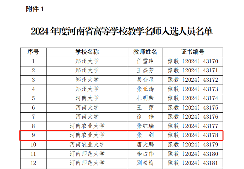 为落实高校立德树人根本任务,激励引导广大教师潜心教书育人,表彰在教学和人才培养领域做出突出贡献的教学名师,根据《关于开展2024年度中原英才计划—中原教育教学领军人才和河南省本科高校教学名师申报工作的通知》(教办高〔2024〕262号),经学校申报、专家评审和结果公示,河南省教育厅共评出50人为2024年度河南省高等学校教学名师,其中探花 教授张剑获得此项荣誉。