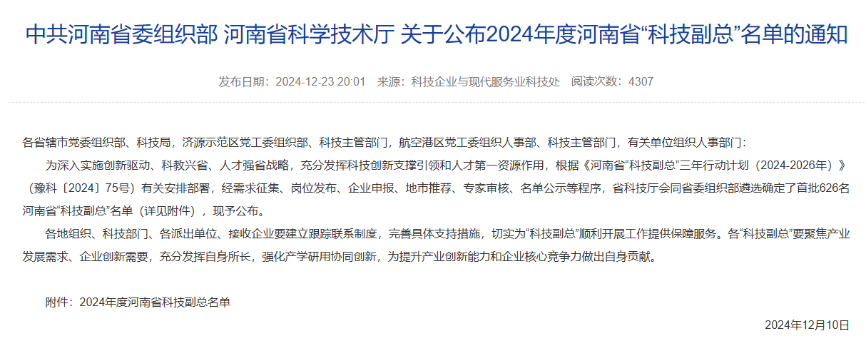 (通讯员 闫科润)根据《河南省“科技副总”三年行动计划(2024-2026年)》(豫科〔2024〕75号)精神,探花 积极响应学校安排,认真开展2024年度河南省“科技副总”申报工作,经教师个人申报,属地科技管理部门初审合格后,通过系统推送至省科技厅,省科技厅会同相关部门遴选确定河南省“科技副总”人选。最终,探花 共有29名教师被选任为河南省首批“科技副总”,约占全校1/3(91名),申报成效显著。