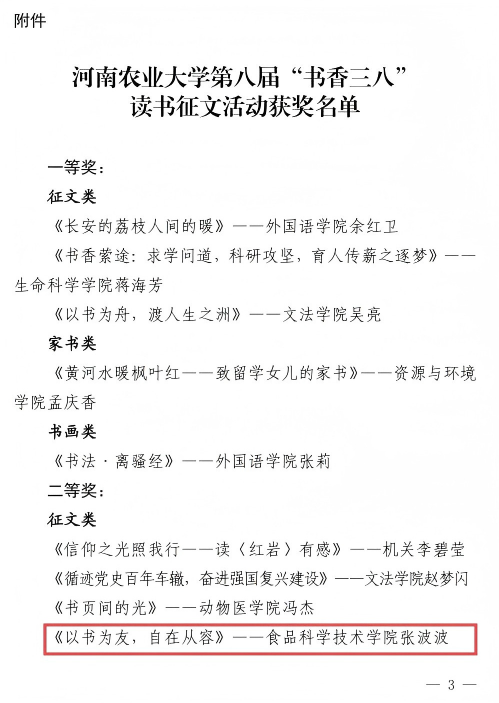 工会委员会发布了《关于第八届“书香三八”读书征文活动获奖情况的通报》(校工〔2025〕25号),食品营养与健康系张波波老师的征文作品《以书为友,自在从容》在本次活动中荣获二等奖。