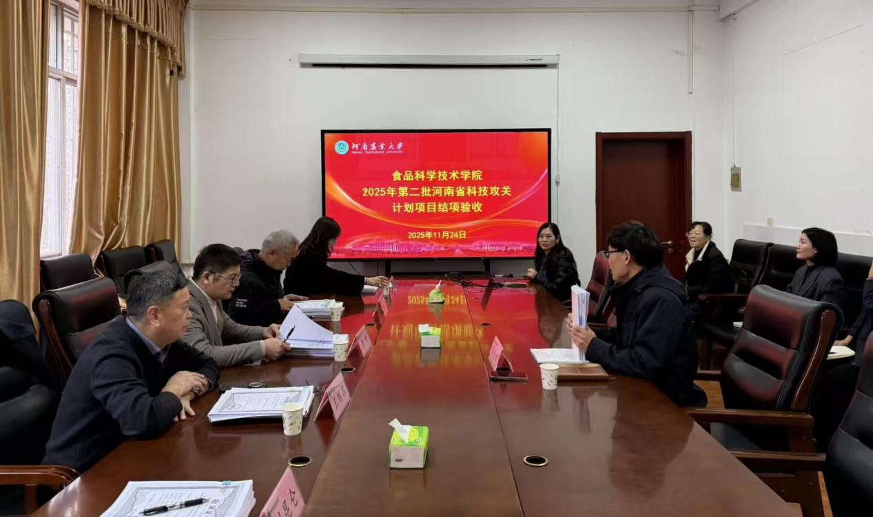 在13号楼309会议室召开2025年第二批科技攻关计划项目及校特殊创新基金项目结项验收会。会议邀请华中农业大学李斌教授、河南省农科院张勋研究员、河南省食品工业科学研究所王瑞国教授级高工、河南牧业经济学院潘春梅教授、河南工业大学刘昆仑教授担任评审专家,院长黄现青及部分老师参会。