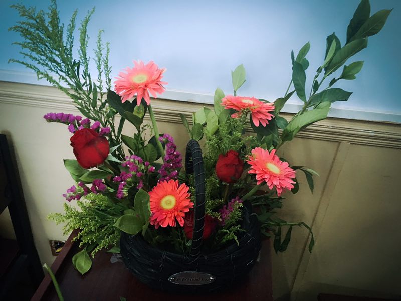 首先,武荣花带领大家一同了解东西方插花的艺术差异,学习插花技艺,并欣赏了优美的插花作品,图文并茂的讲解方式、亲和幽默的语言风格,让大家在轻松愉悦的氛围中不禁跃跃欲试。随后进入实战演练的环节,大家根据所提供的的花材和花泥,开始进行修剪花枝、整理花朵、讨论扦插位置等工作,并逐步掌握插花要领和技艺。武荣花强调,插花要讲究空间感、层次感、疏密交替,大家心领神悟。不久,学院女教职工们便将一朵朵玫瑰、康乃馨等巧妙搭配,创作出一束束让人赏心悦目的花艺作品。现场花香四溢、气氛热烈,营造了一场视觉、嗅觉双重享受的盛宴。