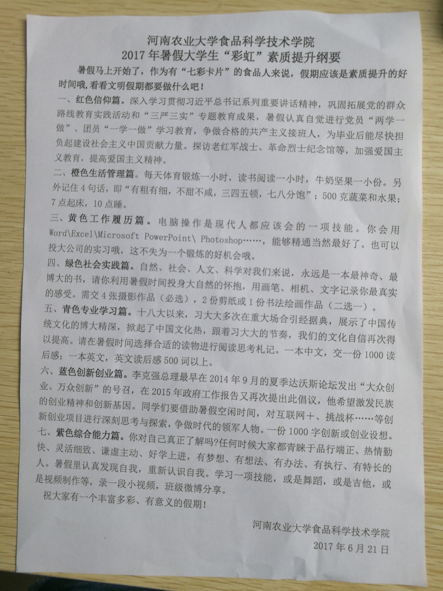 在2017年暑假到来之际, 学院结合学生工作实际,以促进学生成长成才为中心,以“立德树人”为目标,以引导学生“文明生活、快乐成长、和谐成才”为主线,以“食品阳光家园”线上交流平台为素质教育载体,探花