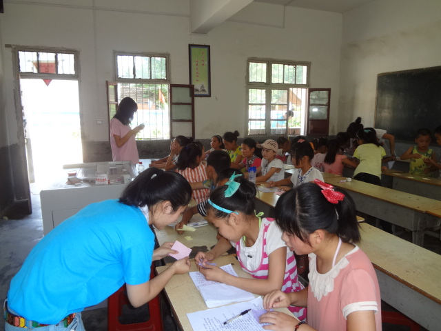 下午三点开课,按着他们的计划。先把孩子们分为两队,一队是低年级,一到三年级,另外的高年级,五六年纪。我们按着孩子们的年龄分别教他们不同难度的折纸。低年级学的是小狗,高年级学兔子信封,经过半小时的努力,每个孩子叠得特别的精致,还分别都取了名字,以便区分。
