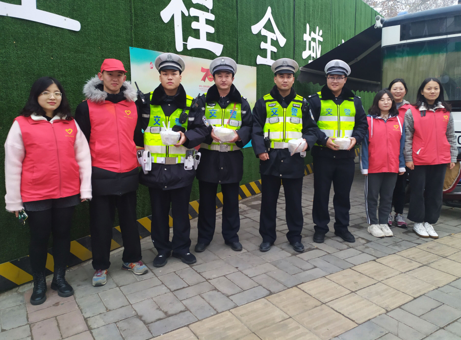 同学们相聚一堂,集体和面、擀皮、包饺子,大家动作娴熟,分工协作,完成了上千个形态各异的饺子。热气腾腾的饺子出锅后,同学们包装好四十余盒爱心水饺,贴上温馨祝福语分别给交警、社区环卫工人、宿管、保洁阿姨和门卫大叔们送去,与他们一起吃饺子、话家常,给他们会送去温暖与祝福,在一片欢声笑语中大家合影留念。同学们纷纷表示这种送温暖活动非常有意义,会一直坚持下去。
