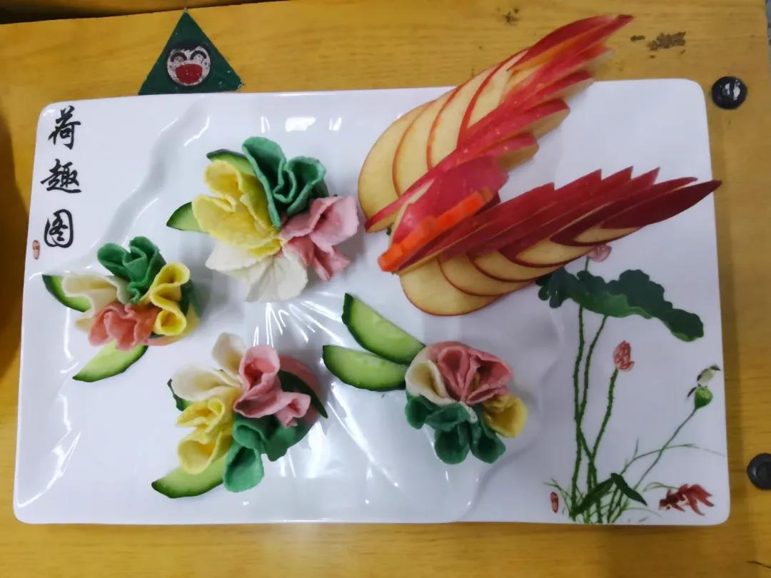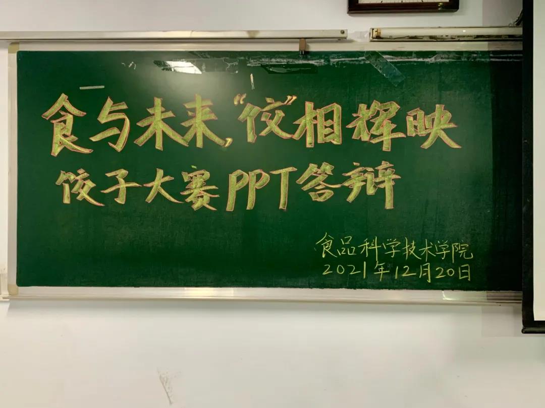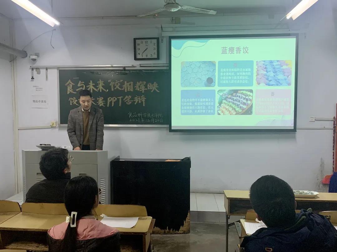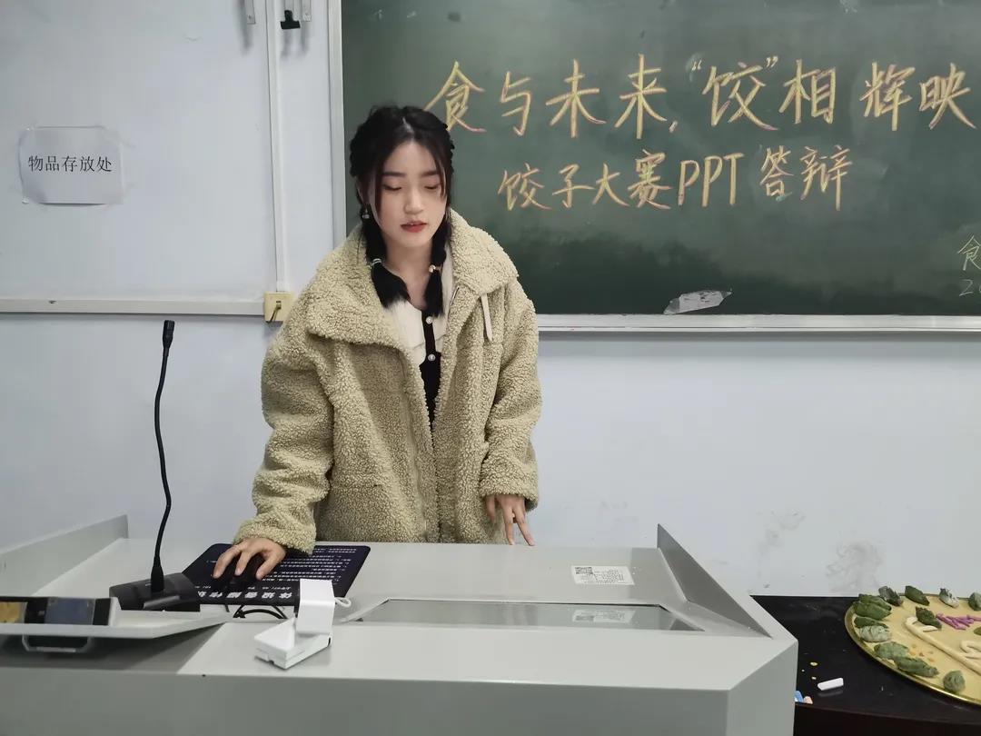 各小组将作品交给老师后,上台进行PPT展示。各参赛小组都准备充分,对各自的作品进行了全面细致的讲解。参赛作品视频制作精美,内容完整,将作品的食材配料、制作过程等进行了充分细致地展示,并对作品的实用性、创新性和市场前景进行了详细介绍。同学们大胆创新,将水果、花瓣、茶叶等食材巧妙地运用到饺子的制作装饰中,使饺子不仅造型美观还营养丰富。参赛作品或对传统饺子的营养和口感等方面进行改进,如《冬季养生局——这馅有说法》加入了养生食材,增加了作品的营养价值,《白玉猪肉饺》采用独特的馅料秘制方式改进饺子口感,提升风味;或在饺子配方、工艺及技术特征等方面做出创新和提高,如《代代有福》,将饺子组合为福袋,不仅外形美观,更是有着“代代有福”的美好寓意。同学们在讲解时游刃有余、声音洪亮、风趣幽默。