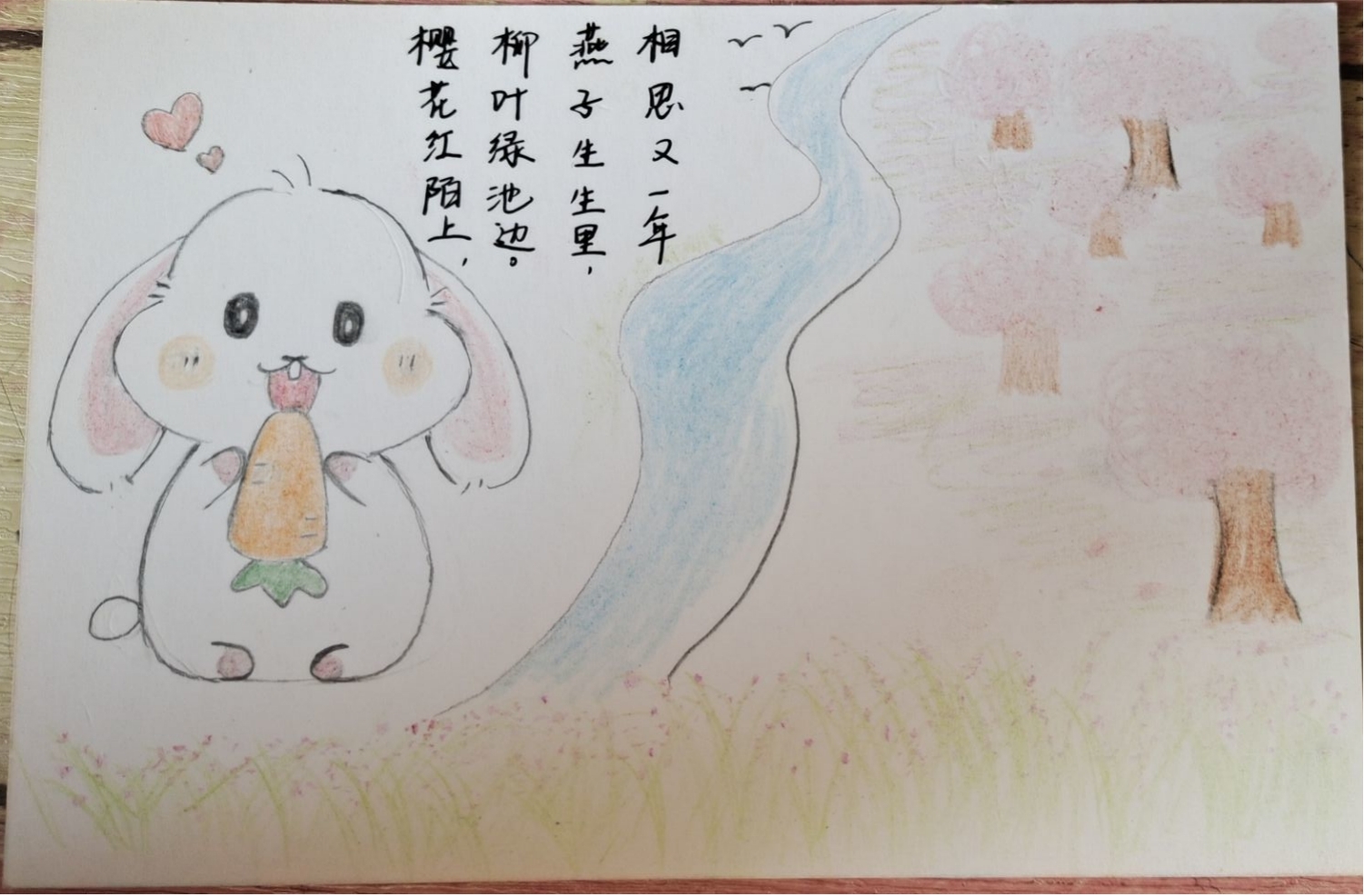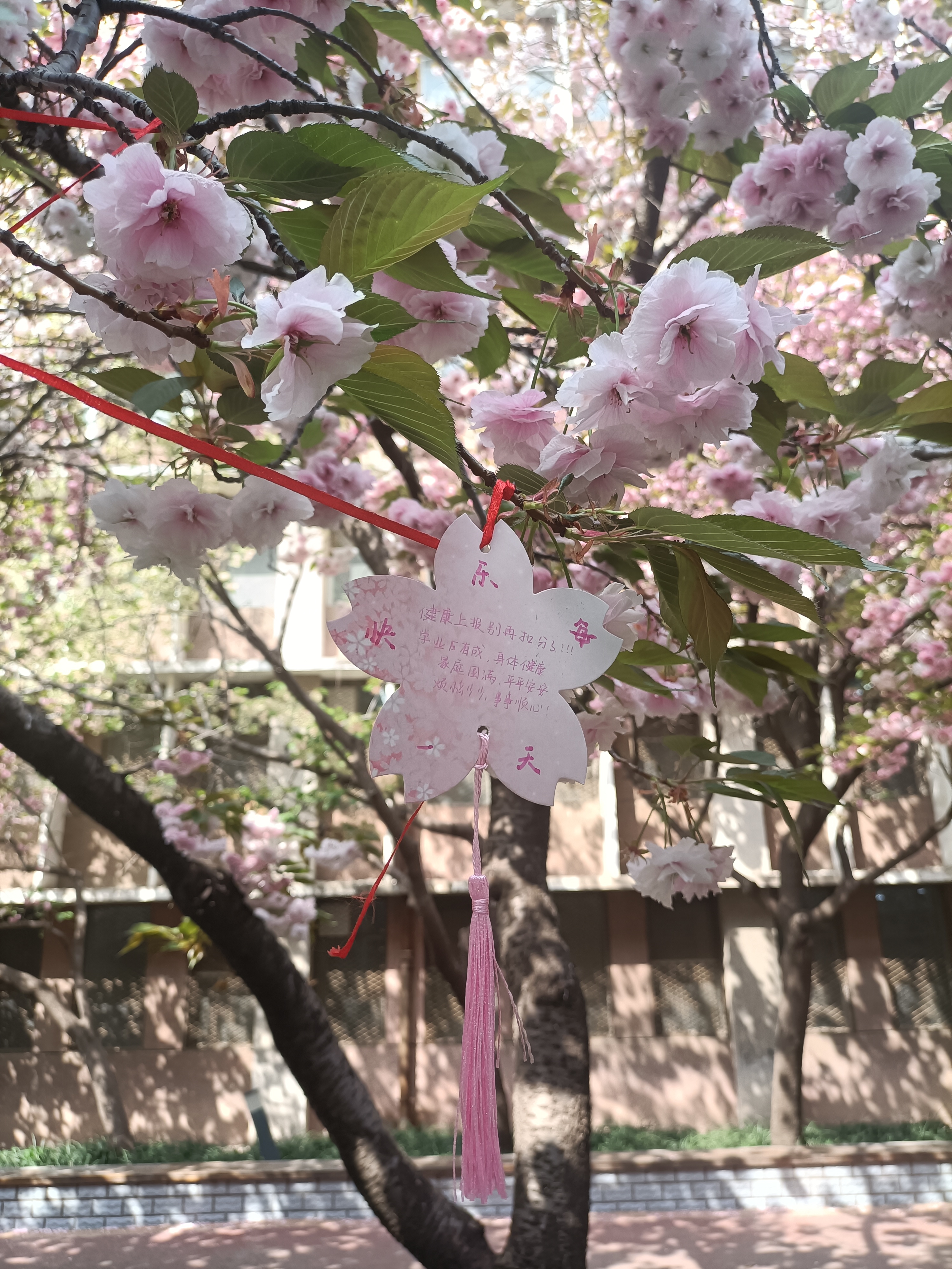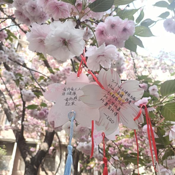 樱花小道旁,同学们把贺卡与樱花相结合,他们或将花粘在贺卡上,添上画上几笔树干制成迷你版樱花树,或将自己赏樱后的所思所想融进作品中,一张张精致的贺卡便慢慢生成,大家将自己的心愿或对农大的祝福写在卡上,挂在花上,随风飘扬,与花共舞。