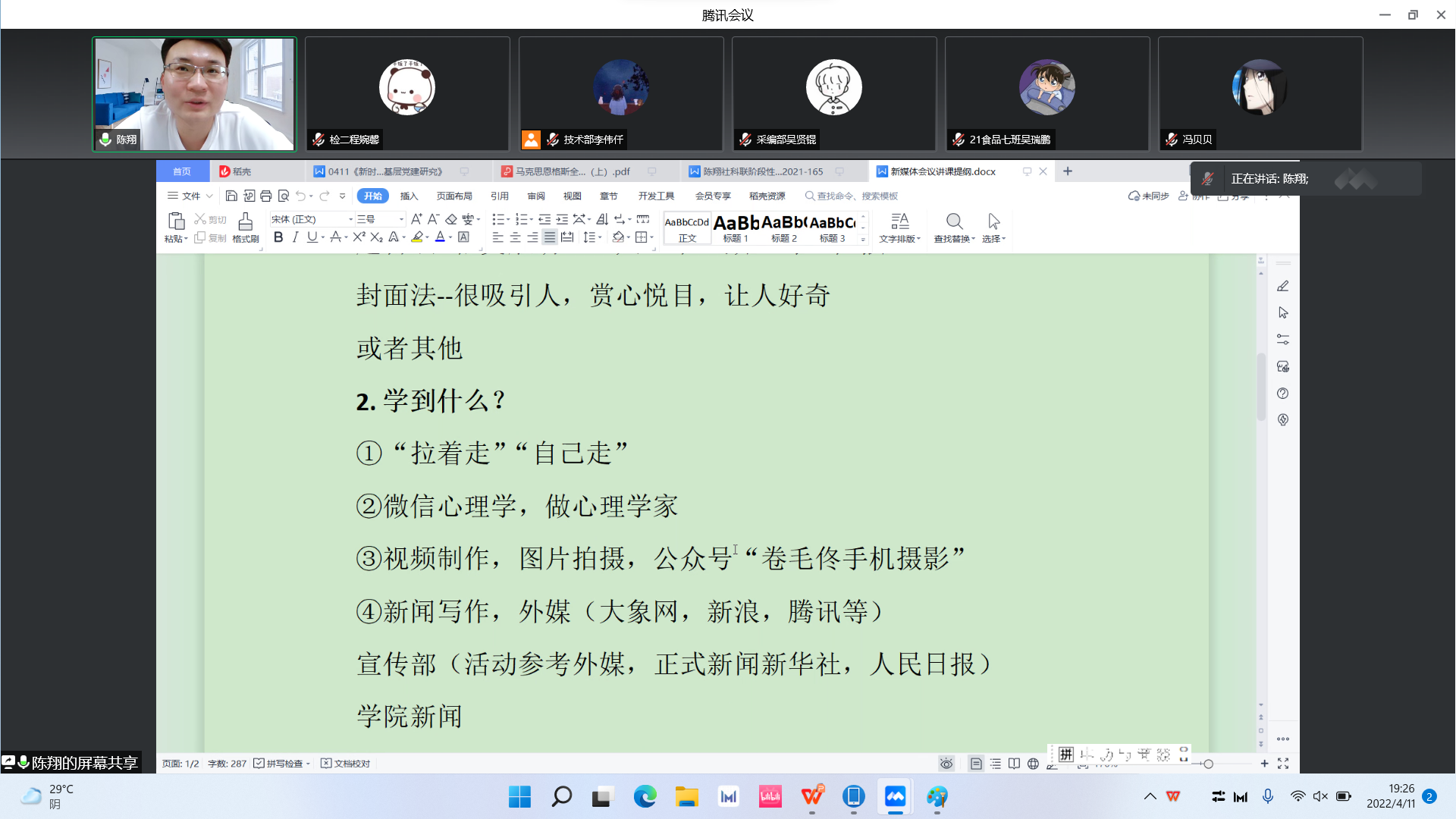 会议开始之前,陈翔组织新媒体全体成员召开了线上例会,他向大家详细讲解了制作高质量微信推文的方法,并希望同学们多学习、多创新、多总结、多思考,通过新媒体工作提高自己的各方面能力。随后,各部门对上一阶段的工作进行汇报总结,新媒体主任梁梦莹针对各部门存在的一系列问题提出解决方法,并对下一阶段的工作进行了安排部署。