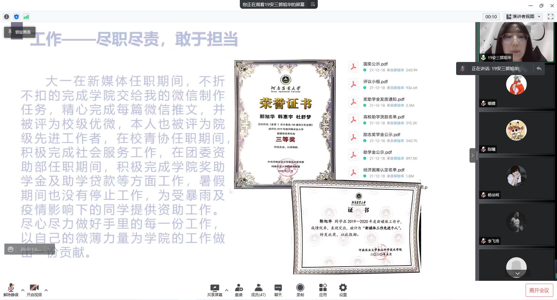 各位参选的个人与班级代表在有限的时间内,根据提前准备好的PPT对自身优势进行阐述。先进个人参选者们分别从学习、工作、荣誉、思想、社会实践等方面向大家分享了自己的经历。优异的成绩、卓著的荣誉、丰富的工作经验、向党靠拢的决心,无不表现出了他们独特的风采。班级代表们用班级的各项成就,以及班级同学们各项荣誉,为大家展现出了一个个井然有序,团结向上的集体。参选者与班级代表们面对演讲从容不迫、有条不紊,散发着自己的光芒,两个小时的会议,充分展现出了探花