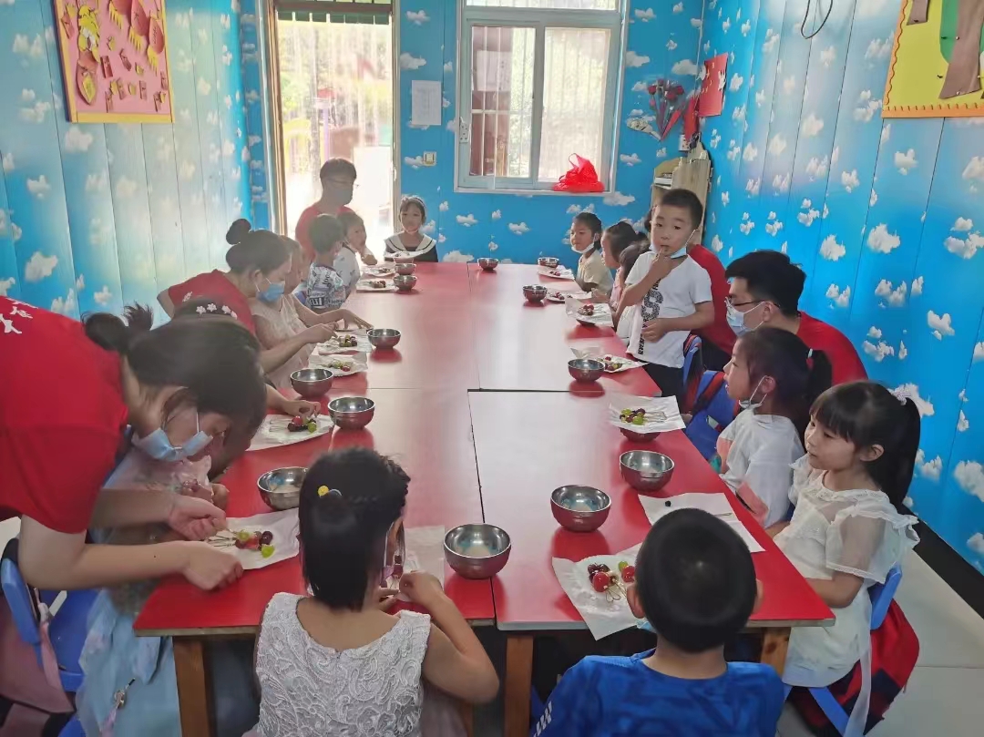 接下来的几天,志愿者们首先将提前准备好的新鲜水果和酸奶发放给小朋友们,教大家制作酸奶水果杯和冰糖水果,在与美食的相约中提高孩子们的动手能力,更重要的是让孩子们感受到了自食其力的乐趣,培养独立能力。