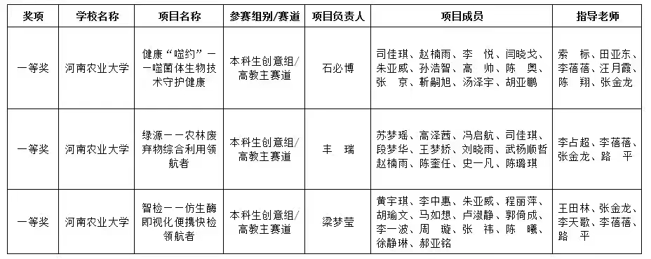 由18级毕业生石必博负责的参赛作品《创安——用噬菌体守护人类健康》和19级食检二班丰瑞负责的参赛作品《惜源——构建农林废弃物综合利用新模式》获评金奖,19级食检三班梁梦莹负责的参赛作品《智检——仿生酶即视化便携快检领航者》获评铜奖。李蓓蓓、路平、陈翔、索标、张金龙、李占超荣获2022年“挑战杯”河南省大学生创业计划竞赛“优秀指导教师”称号。