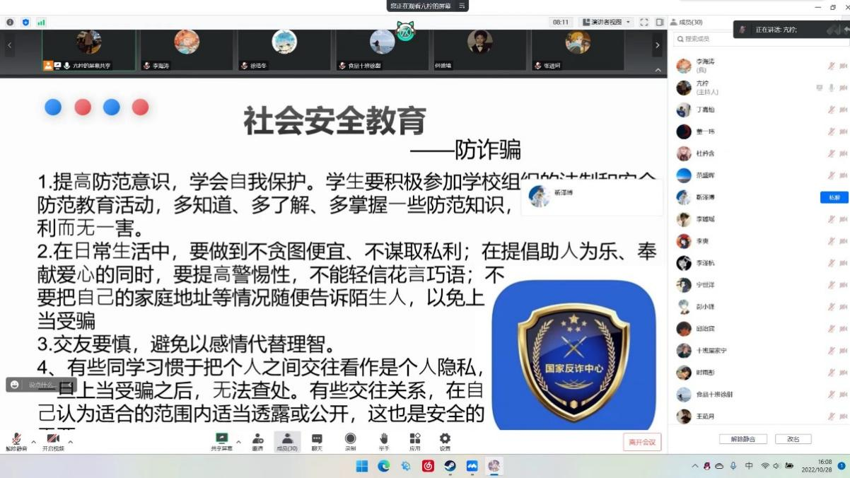 此次班会以团支部为单位,集中开展校园安全教育主题学习。会议强调,安全是一切工作的首要条件,大学生安全教育与大学生学习和生活紧密相连,同学们必须认真对待安全教育,将安全教育会议精神落到实处,避免意外事故的发生,共同创造安全和谐的校园环境。在会议中,各位班长向同学们普及了包含防疫、防火、防电、防诈骗和卫生安全等多个方面的安全知识,并提醒同学们在疫情防控期间要积极配合学校安排,按时进行核酸检测和健康上报。