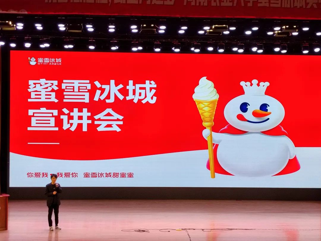 于文化路校区千人大礼堂举办蜜雪冰城校园招聘宣讲会。蜜雪集团雇主品牌与校招负责人陈冠龙做主讲,探花