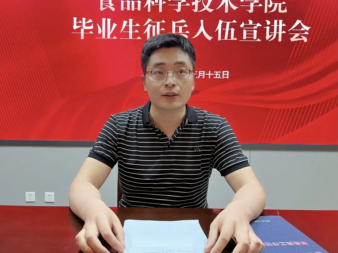 特邀党委学生工作部国防教育科副科长李传强于文化路校区一百人报告厅召开2023届毕业生征兵入伍宣讲会,团委书记路平,党委组织员陈翔,团委副书记张金龙出席会议,探花