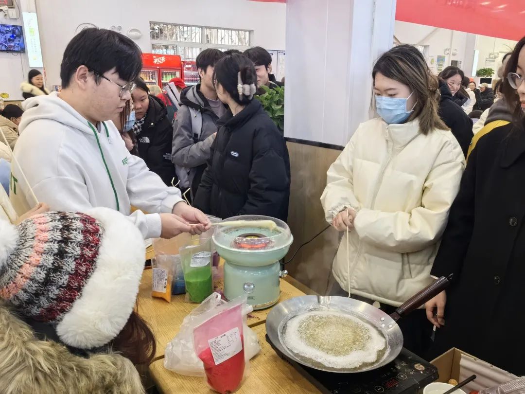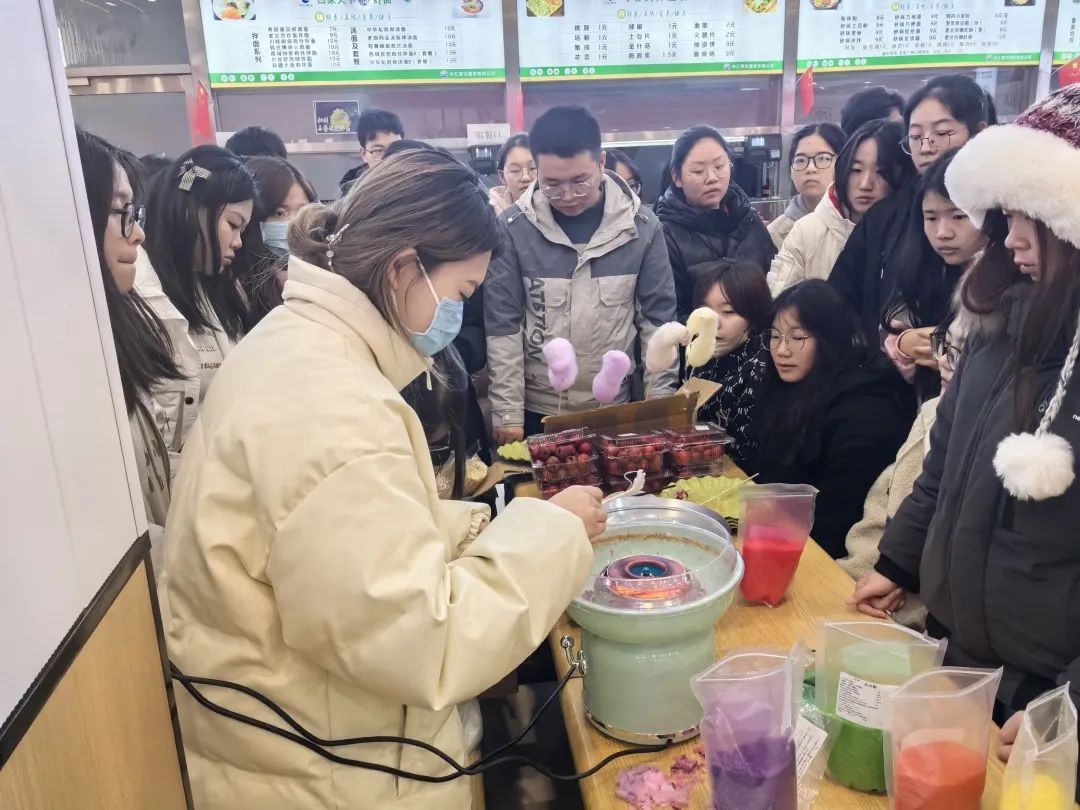 准备了糖葫芦、棉花糖等美食,感兴趣的同学也亲自上手体验,其乐融融。鲜红欲滴的糖葫芦配上绵软甘甜的棉花糖,让人在寒冷的季节仍拥有心中的温暖。