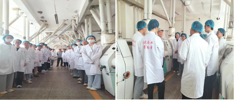 学生们进入企业后,首先由崔慧霞主任向学生详细介绍了河南金苑粮油有限公司的探花、生产规模及产品种类等。崔主任指出金苑始终坚持“以质量求生存,以信誉求发展”的经营理念;采用国内先进的生产工艺,将优质小麦进行合理搭配,生产出符合市场需求的高质量专用粉、民用粉和挂面等。其次制粉车间孟伟主任向学生强调了进入制粉车间的安全和卫生方面的要求,要求学生严格遵守企业规章制度,需在更衣室换好实验服、戴好头套、脚套后进入车间,保证车间卫生质量,同时需注意个人安全,车间内未经同意不得私自开启或关闭生产设备等。接下来孟主任带领学生到达制粉车间中心控制室,通过自动化控制软件向学生们详细介绍了小麦清理流程、制粉工艺流程和配粉环节等,使学生们更加明确了本次生产实习的内容和任务。