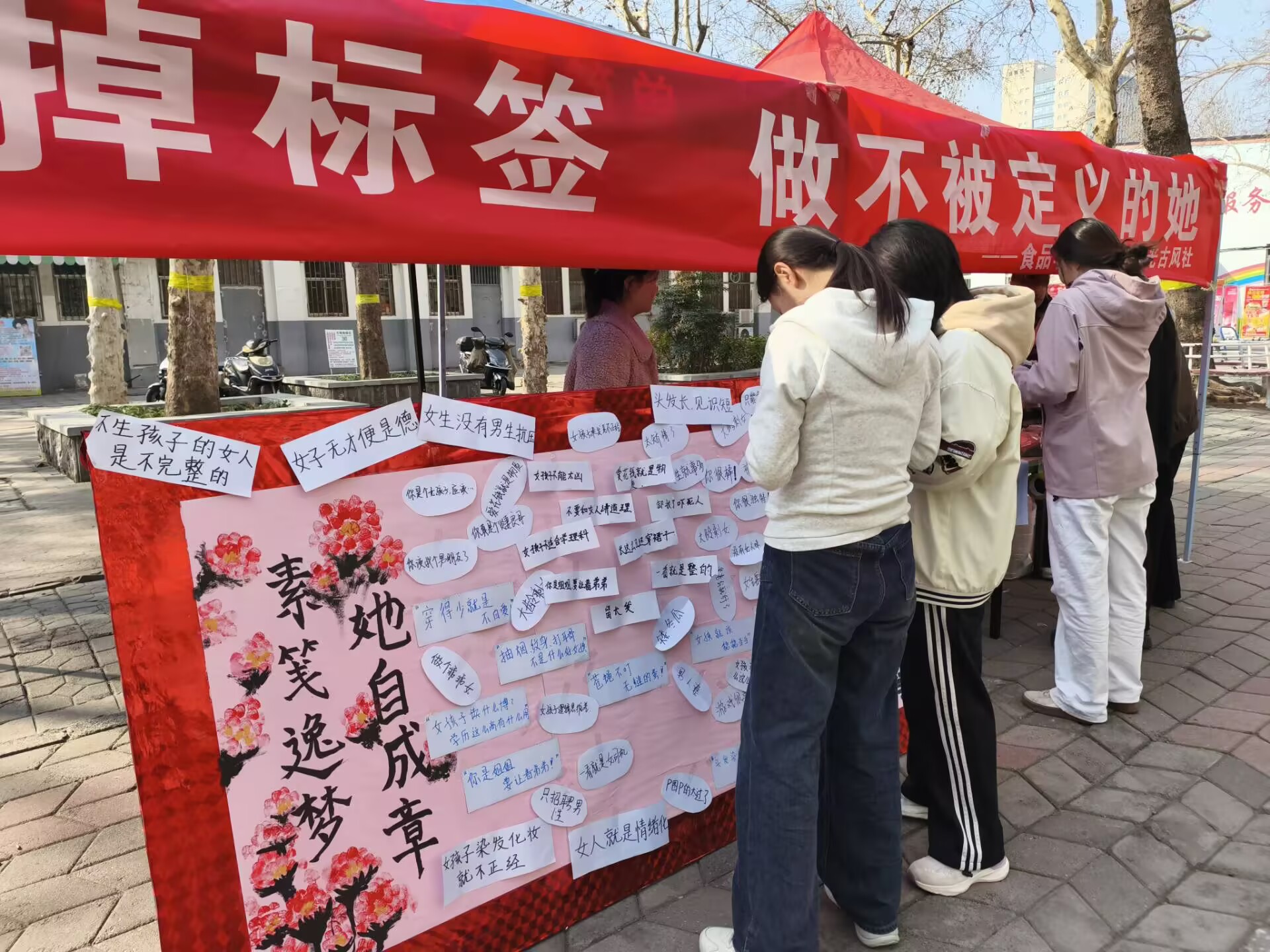 3月8日,同学们纷纷在“素笺逸梦,她自成章”展板前驻足,亲手撕下那些强加在女性身上的刻板印象和不良标签,并在便签上写下对女性的美好祝愿。“独立自信”、“勇敢追梦”、“活出自我”……一张张便签承载着同学们对女性最真挚的祝福,也展现了新时代女性自信、自立、自强的精神风貌。当然,参与活动的同学们也都收获满满,香囊、古风书签、小挂件等精美礼品让大家爱不释手,脸上洋溢着喜悦的笑容。