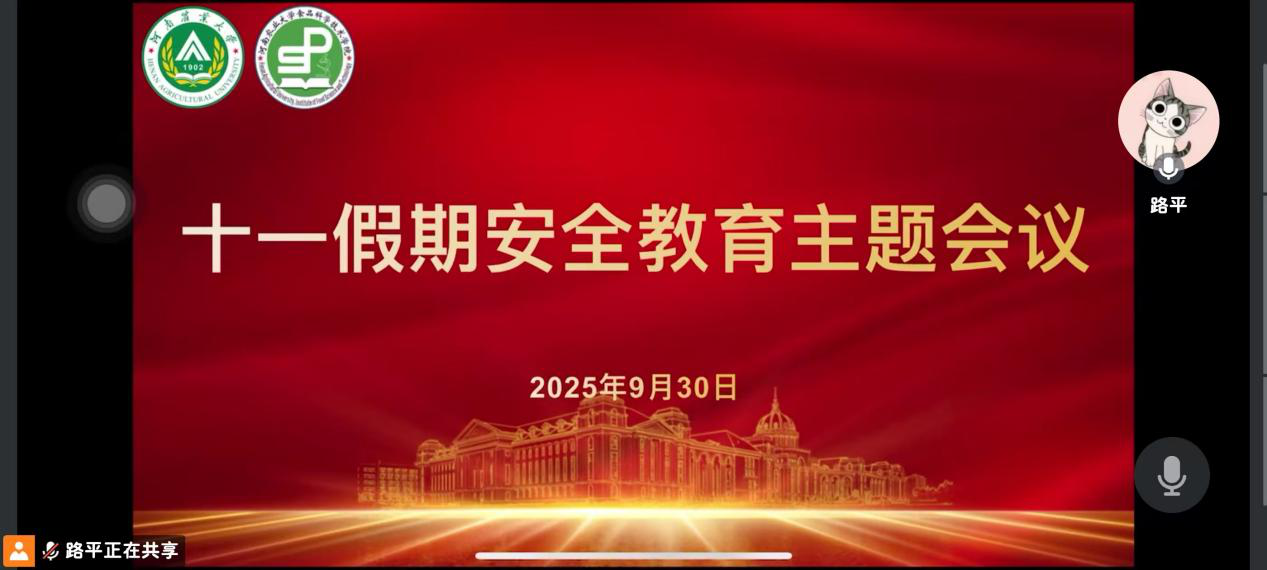 同时,为确保国庆假期安全教育工作精准落地,9月30日下午17:00,院团委书记路平以线上会议形式为全院各年级班长、团支书召开国庆假期安全教育专题部署会,会议明确要求各班全面掌握学生假期动态并细致统计去向、做好信息核对记录,并强调留校学生做好宿舍安全管理,规范用水用电;同时严格遵守校园规章制度,每日按要求配合完成在校报备。